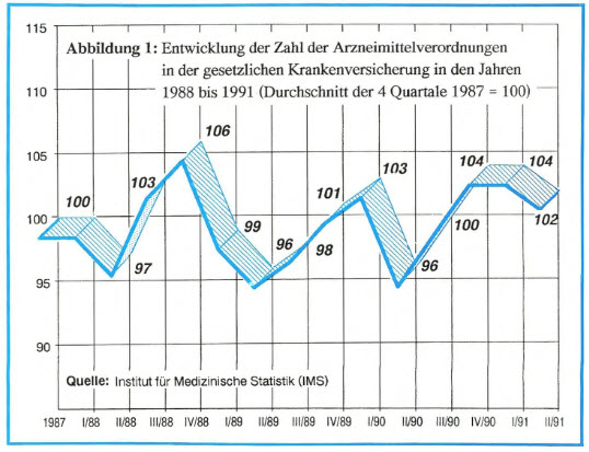 Die gesetzliche Krankenversicherung meldet für das 1. Halbjahr 1991 einen deutlichen Anstieg der Arzneimittelausgaben. Wie so oft, wird hieraus von voreiligen Kritikern wieder einmal der Schluß gezogen, die Kassenärzte verordneten aus irrationalen Gründen immer mehr Präparate. Eine sorgfältige Analyse der Verordnungskostenentwicklung in den letzten Jahren belegt dagegen, daß sich die Entwicklung der Arzneimittelausgaben im 1. Halbjahr 1991 durchaus im zu erwartenden Rahmen bewegt. Ein wesentlicher Grund für die offensichtliche Verunsicherung bei den Krankenkassen ist wohl in der Tatsache zu sehen, daß die prozentualen Wachstumsraten der Arzneimittelausgaben der Krankenkassen seit Ende 1988 nicht mehr geeignet sind, ein zutreffendes Bild der tatsächlichen Verordnungssituation zu vermitteln. Der sogenannte „Blüm-Bauch” im 4. Quartal des Jahres 1988 war nur der Beginn für die seither festzustellende unregelmäßige Entwicklung der Verordnungskosten, die durch das Inkrafttreten arzneimittelpolitischer Maßnahmen (insbesondere durch die Festbetragsregelung) ausgelöst worden ist.