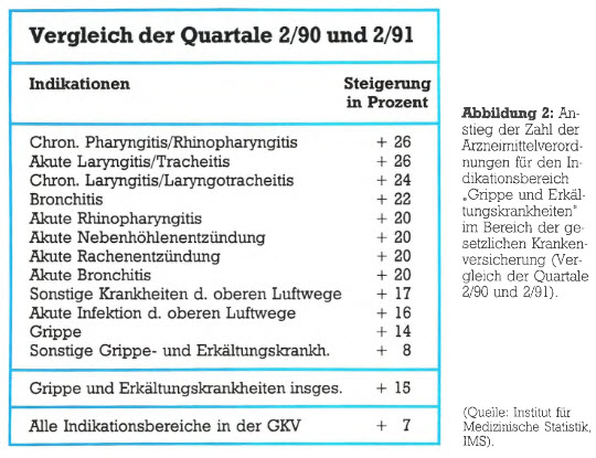 Eine Besonderheit im 2. Quartal 1991 ist dagegen insofern eingetreten, als das Verordnungsvolumen — im Gegensatz zu den in Vorjahren zu beobachtenden Trends — im Indexvergleich nur unwesentlich, nämlich von 104 auf 102, abgesunken ist. Im Vergleich zum Vorjahresquartal, also dem 2. Quartal des Jahres 1990, ergibt sich hierdurch eine vergleichsweise große Differenz von sechs Prozentpunkten. Da aus Abbildung 1 der Eindruck gewonnen werden kann, daß das Verordnungsverhalten der Ärzte hinsichtlich der Verordnungszahlen in den vergangenen vier Jahren sehr konstant geblieben ist, liegt die Vermutung nahe, daß der Sonderfall des 2. Quartals 1991 auf exogene Ursachen zurückzuführen ist, die nicht in der Verordnungsverantwortung der Kassenärzte liegen. Diese Vermutung kann durch eine Analyse der Verordnungsschwerpunkte des 2. Quartals 1991 bestätigt werden. Aus Abbildung 2 ergibt sich nämlich, daß der große Indikationsbereich „Grippe- und Erkältungskrankheiten” im Vergleich der Quartale 2/90 und 2/91 mit rund 15 Prozent ganz erheblich zugenommen hat, so daß bereits hieraus ein Großteil des Ergebnisses im 2. Quartal 1991 erklärt werden kann.