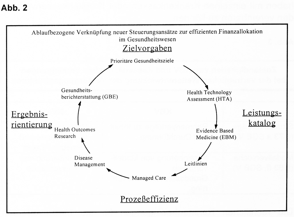 In Abbildung 2 ist dargestellt, daß sich das Managed-Care-Instrument unter dem Aspekt der Verbesserung der „Prozeßeffizienz“ somit nahtlos in den ablaufbezogenen Kreislauf möglicher Steuerungsansätze zur effizienten Finanzallokation im Gesundheitswesen einordnet. Ausgehend von der Beschränkung der Zielvorgaben auf die prioritären Gesundheitsziele und die Einschränkung des Leistungskataloges auf der Grundlage von Evidence-Based-Medicine reicht das Spektrum dieser Steuerungsansätze über das Managed-Care-System schließlich bis zum Schlagwort der Ergebnisorientierung ärztlichen Handelns. Es mag sein, daß der unauflösbar scheinende Widerspruch zwischen wachsendem Bedarf und sinkendem Deckungspotential keine anderen Auswege zuläßt; es wäre jedoch fatal, wenn in der öffentlichen Diskussion verschwiegen würde, daß alle diese Ansätze mit der „Freibiermentalität“ im Gesundheitswesen, die den Bürgern bis heute aus der großen Koalition von Gesundheitspolitikern, Krankenkassen und Medien vermittelt wird, auch nicht einmal mehr ansatzweise in Deckung zu bringen sind.
