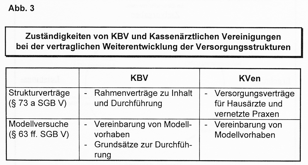 Die Kassenärztliche Bundesvereinigung hat sich im Gesetzgebungsverfahren zum 2. GKV-Neuordnungsgesetz nachhaltig dafür eingesetzt, mit den Modellvorhaben nach § 63 ff. SGB V und insbesondere den Strukturverträgen nach § 73 a SGB V die rechtlichen Möglichkeiten zur Weiterentwicklung der Versorgung entscheidend zu verbessern. Der Gesetzgeber hat damit in der Tat die vertraglichen Möglichkeiten der gemeinsamen Selbstverwaltung erweitert und dabei – wie Abbildung 3 zeigt – die Zuständigkeiten von KBV und Kassenärztlichen Vereinigungen im Rahmen dieser vertraglichen Weiterentwicklung der Versorgungsstrukturen klar festgelegt. Während die Grundsätze zur Durchführung der Modellversuche und die Rahmenverträge zu Inhalt und Durchführung von Strukturverträgen Aufgabe der KBV und der Spitzenverbände der Krankenkassen sind, werden die Vereinbarung von Modellvorhaben selbst sowie die Vereinbarung der Versorgungsverträge für Hausärzte und vernetzte Praxen auf der Ebene der Kassenärztlichen Vereinigungen und der Krankenkassen bzw. ihrer Landesverbände wahrgenommen. Eine Ausnahme in dieser ansonsten klaren Gliederung ist nur durch die rechtlich und vertragspolitisch interessante Kompetenz der Kassenärztlichen Bundesvereinigung gegeben, selbst Modellvorhaben mit einzelnen Krankenkassen oder Krankenkassenverbänden vereinbaren zu können.
