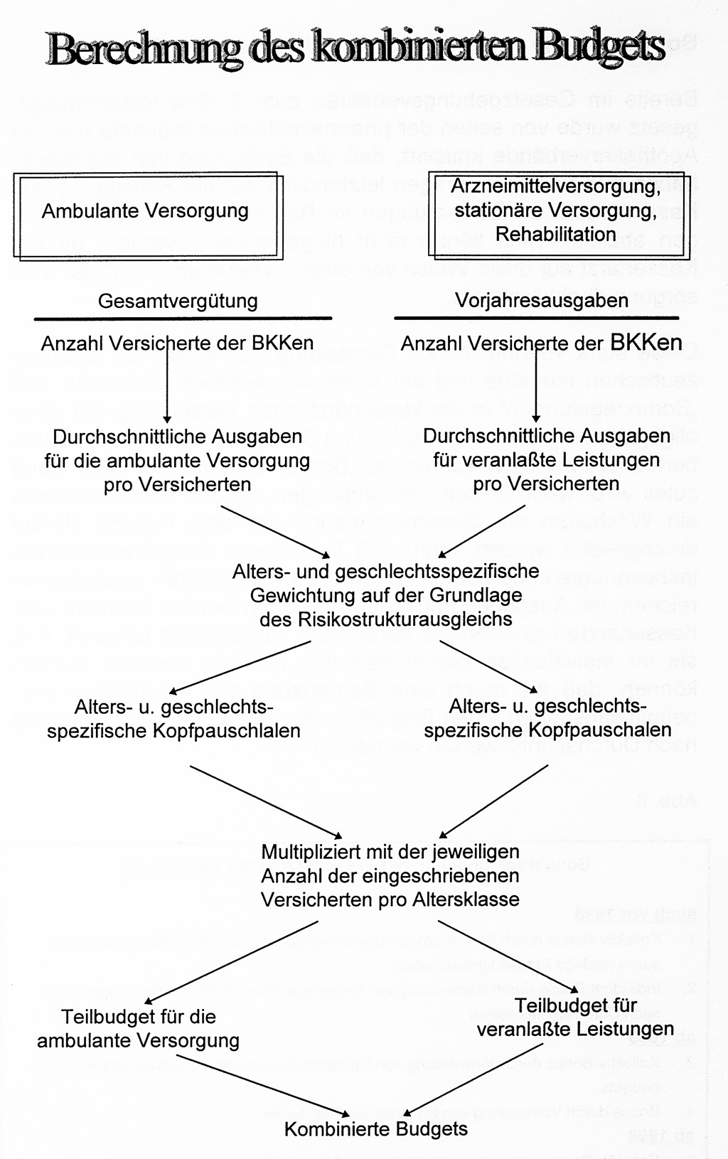 In Abbildung 7 ist hinsichtlich des Teilaspekts der Berechnung eines kombinierten Budgets ein Ablaufplan wiedergegeben, wie er im Rahmen des BKK-Modellvorhabens in Berlin angewendet werden soll. Die Berechnung von kombinierten Budgets verursacht im übrigen gerade bei den Betriebskrankenkassen erhebliche Probleme, da aufgrund der großen Zahl der Betriebskrankenkassen und der Verteilung der Versicherten einzelner großer Betriebskrankenkassen auf die Bereiche sehr vieler Kassenärztlicher Vereinigungen bereits mit einem einzigen Modellversuch in einer einzigen Kassenärztlichen Vereinigung indirekt sehr viele Kassenärztliche Vereinigungen über den sogenannten „Fremdkassenausgleich“ vertragsrechtlich berührt werden. Dies ist auch der Grund, warum gerade der Bundesverband der Betriebskrankenkassen eine bundesweite vertragliche Regelung mit der Kassenärztlichen Bundesvereinigung zu dieser Problematik anstrebt.