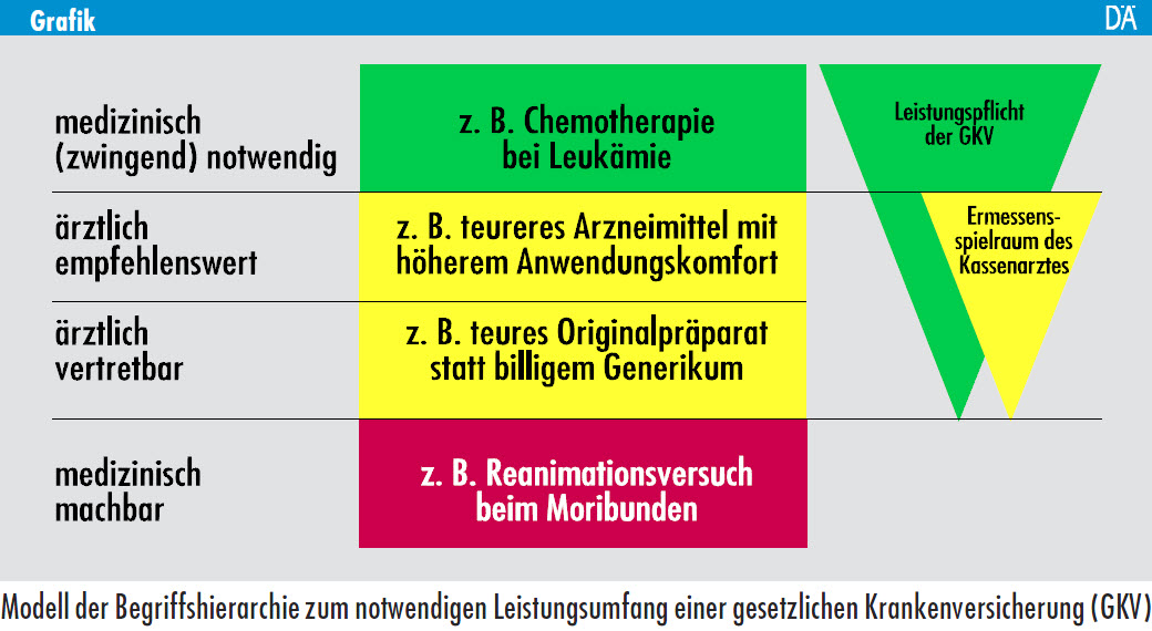 Um diesen Sachverhalt auch sprachlich zur Geltung zu bringen, ist der angesichts strikt limitierter Finanzmittel unbrauchbare, da unscharfe Begriff der „medizinischen Notwendigkeit“ zu trennen in „medizinisch zwingend notwendig“ (als Synonym für den nicht weiter disponiblen Anspruch auf „Kernleistungen“ in der gesetzlichen Krankenversicherung) und „ärztlich empfehlenswert“ (jedoch nicht medizinisch zwingend notwendig) auf der anderen Seite (siehe Grafik).